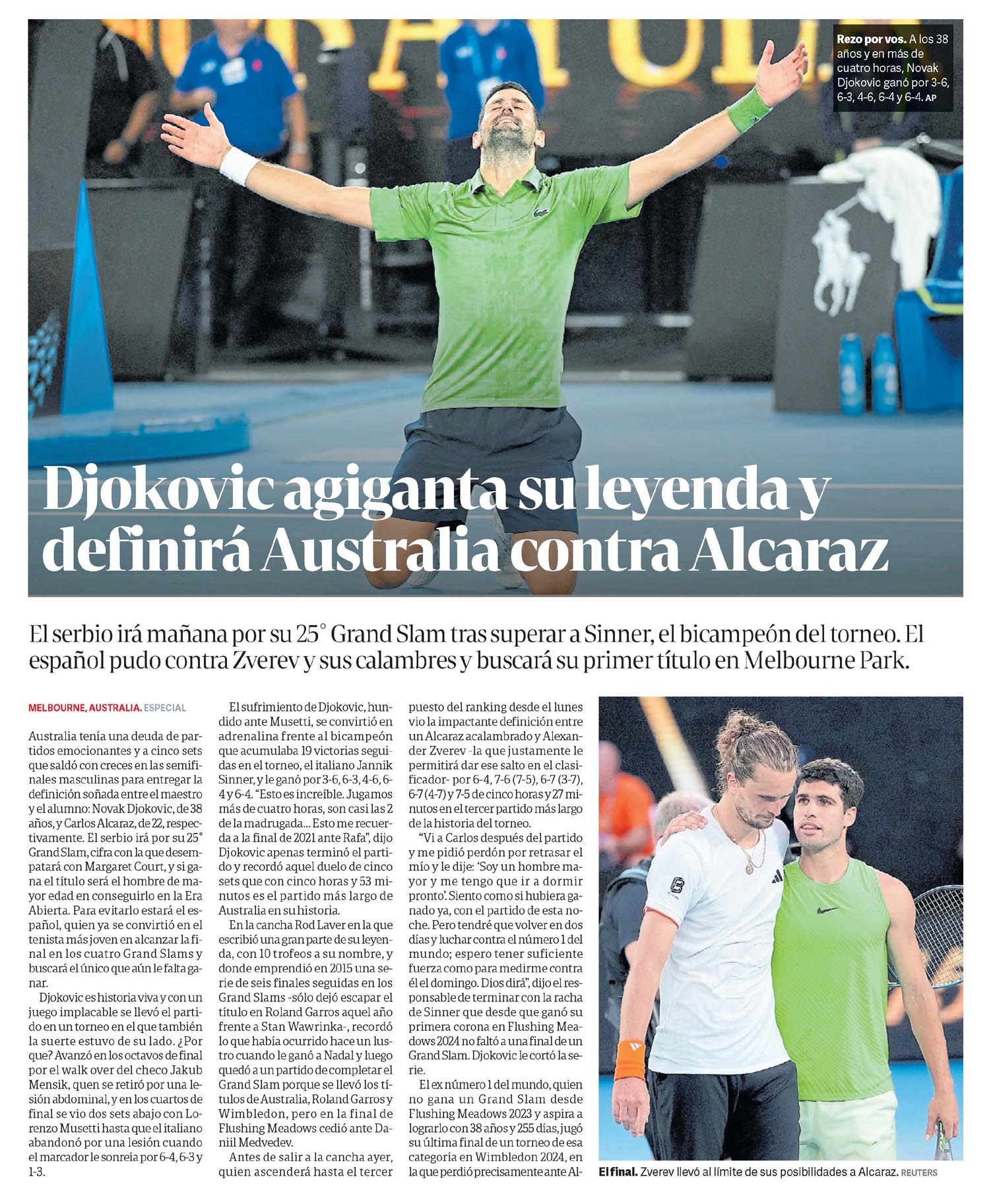 31/01/2026 00:52 · Clarín Djokovic agiganta su leyenda y definirá Australia contra AlcarazEl serbio irá mañana por su 25° Grand Slam tras superar a Sinner, el bicampeón del torneo.? |