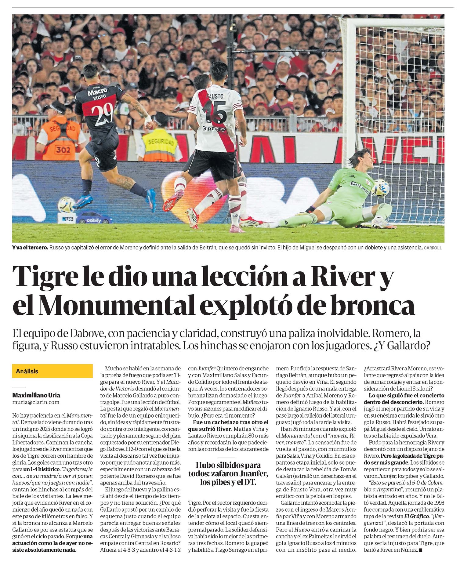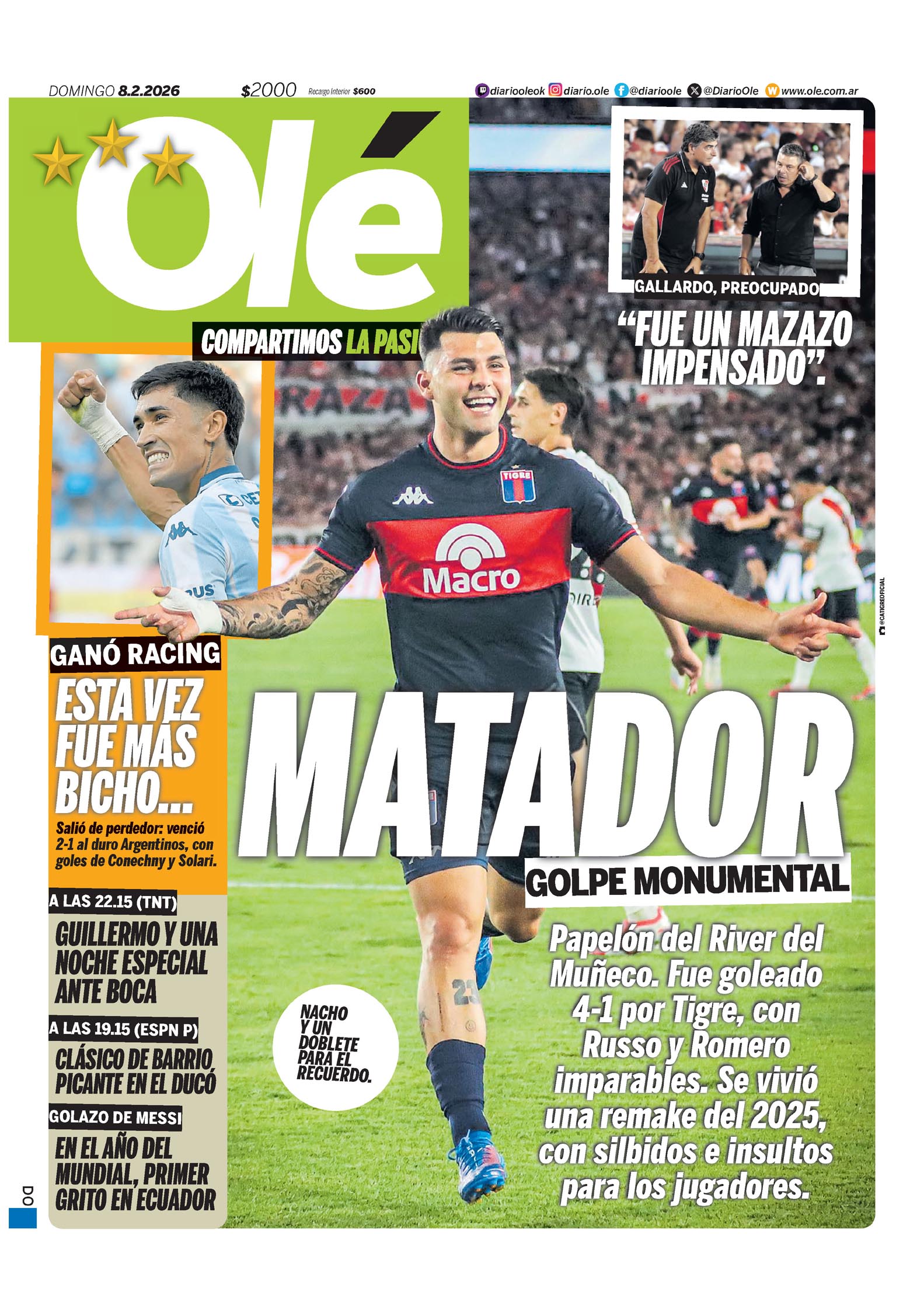 08/02/2026 04:57 · Olé Olé TapaMATADOR GOLPE MONUMENTAL Papelón del River del Muñeco.? 08/02/2026 01:19 · Clarín · Maximiliano Uría Tigre le dio una lección a River y el Monumental explotó de broncaY va el tercero.?