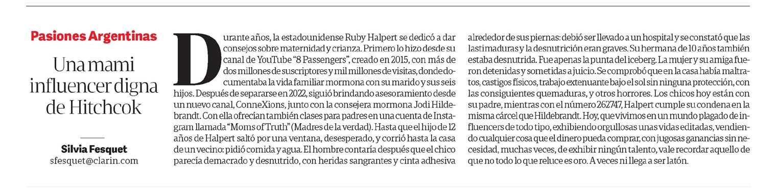 08/02/2026 01:28 · Clarín · Silvia Fesquet Una mami influencer digna de Hitchcock