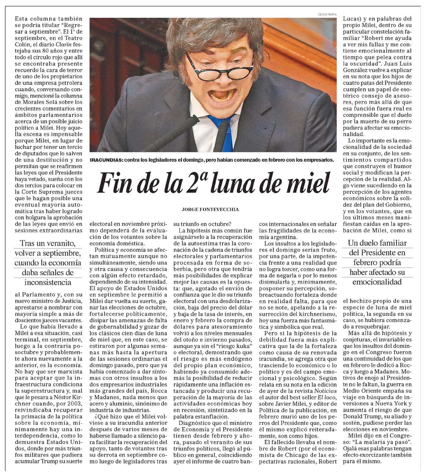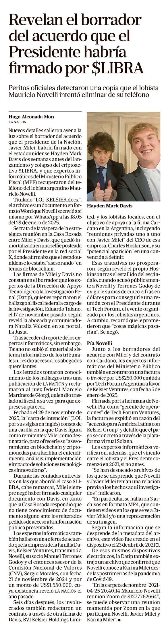 07/03/2026 03:02 · La Nación · Francisco Olivera Más descortés que "el Soviético", la retórica del modelo de Milei07/03/2026 02:51 · La Nación · Hugo Alconada Mon Revelan el borrador del acuerdo que el Presidente habría firmado por $LIBRA07/03/2026 02:49 · La Nación · Hernán Cappiello Declaró el primer dirigente en el caso por presunta evasión07/03/2026 01:13 · Perfil · JORGE FONTEVECCHIA Fin de la 2° luna de miel