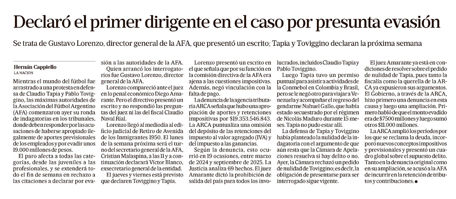 Puntos de vistaResumen de Columnistas Políticos - Temas centrales destacadosRicardo Roa, Marcelo Bonelli y Daniel Santoro (Clarín / La Nación)El mundo del fútbol y la política se entrelazan en la AFA. Daniel Santoro destaca que Claudio Tapia intentó sumar a tres miembros del gobierno de Milei al Comité Ejecutivo de la AFA, pero fue vetado, reflejando tensiones internas en la entidad deportiva. Además, Hernán Cappiello informa que Gustavo Lorenzo, director general de la AFA, declaró en un caso por presunta evasión, mientras Tapia y Toviggino están próximos a declarar. También se revela que una firma ligada a Toviggino blanqueó 1,4 millón de dólares, poniendo en foco la transparencia y las finanzas en el fútbol argentino. Jorge Fontevecchia (Perfil)Fin de la segunda luna de miel política. Fontevecchia analiza el fin de la etapa de tolerancia y apoyo hacia los legisladores y empresarios, con crecientes iracundias y tensiones que anticipan un escenario electoral complejo para noviembre próximo. Hugo Alconada Mon (La Nación)Investigación sobre borrador de acuerdo presidencial. Alconada Mon revela detalles sobre un borrador de acuerdo que el Presidente habría firmado, detectado por peritos oficiales en un teléfono que un lobista intentó eliminar, lo que abre interrogantes sobre la transparencia y negociaciones en el poder. Gerardo Milman y contexto sindical (La Nación)Conflictos entre Gobierno y sindicatos. Se informa que el Gobierno inició acciones contra UTA y La Fraternidad, mientras los sindicatos denuncian una ?sanción política?. Además, Gerardo Milman, exmano derecha de Patricia Bullrich, consiguió un cargo en el Senado pese al veto de Karina Milei, mostrando las disputas internas en el oficialismo.