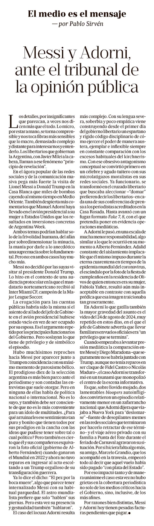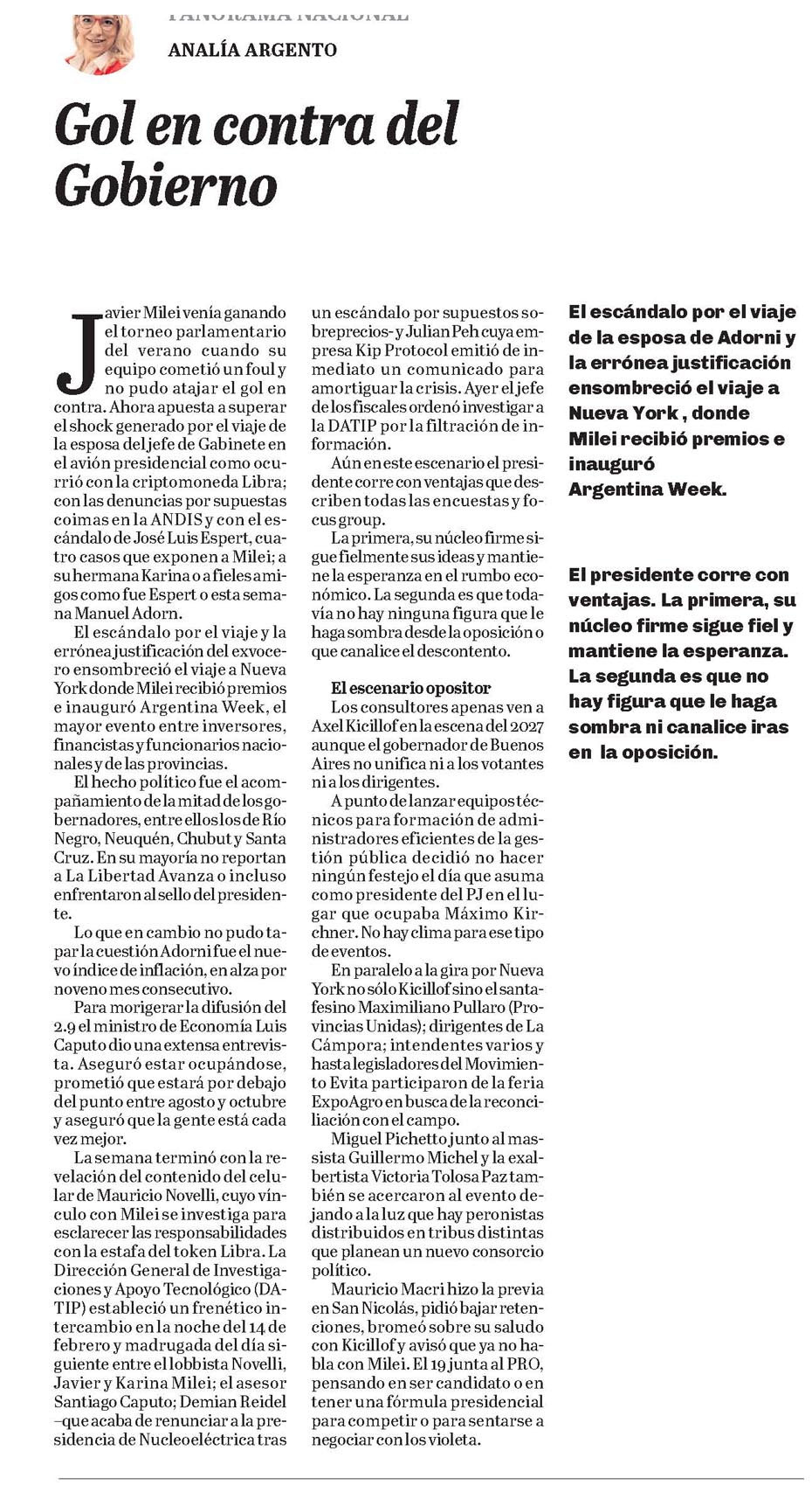 15/03/2026 05:09 · Río Negro (Río Negro) · ANALÍA ARGENTO Gol en contra del Gobierno15/03/2026 03:10 · La Nación · Jorge Fernández Díaz Una ardiente guerra fría15/03/2026 02:56 · La Nación · Laura Serra Miguel Pichetto: "Se necesita una visión amplia; las terceras vías van a estar en dificultades en 2027"15/03/2026 02:40 · La Nación · Pablo Sirvén Messi y Adorni, ante el tribunal de la opinión pública |