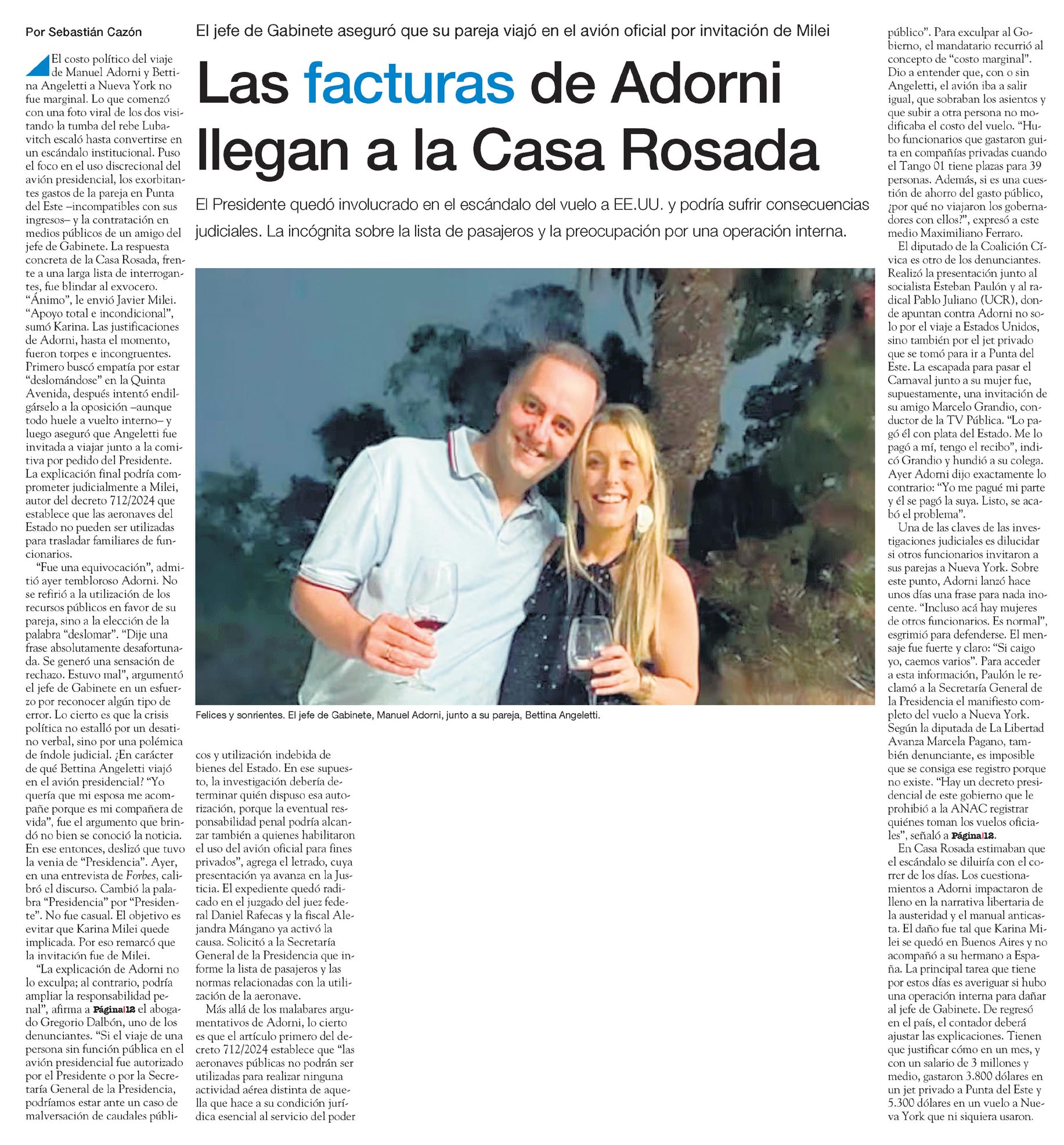 15/03/2026 03:25 · Página 12 · Sebastián Cazón Las facturas de Adorni llegan a la Casa RosadaEl jefe de Gabinete aseguró que su pareja viajó en el avión oficial por invitación de Milei Las facturas de Adorni llegan a la Casa Rosada El costo político del viaje de Manuel Adorni y Bettina Angeletti a Nueva York no fue marginal.?