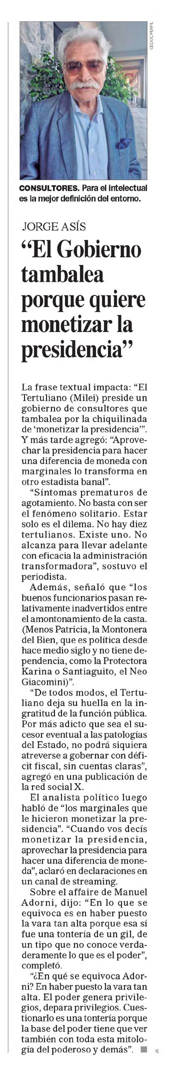 En "El Gobierno tambalea porque quiere monetizar la presidencia", Asís plantea que la inestabilidad del gobierno se debe a su intento de capitalizar políticamente la figura presidencial, lo que genera tensiones internas y debilita la gestión. La columna destaca la complejidad del contexto político y la lucha por el control del poder.