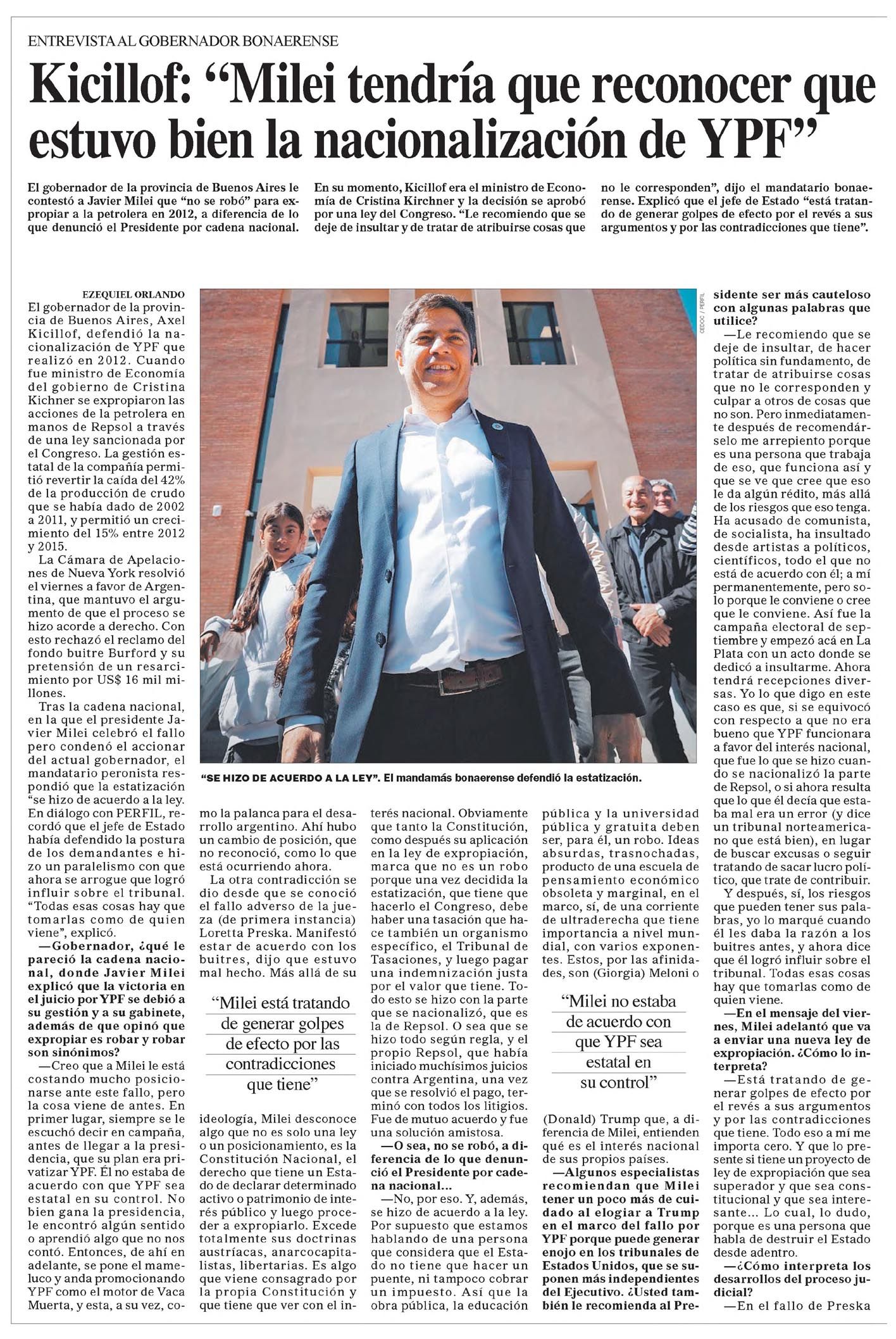 Kicillof: "Milei tendría que reconocer que estuvo bien la nacionalización de YPF"