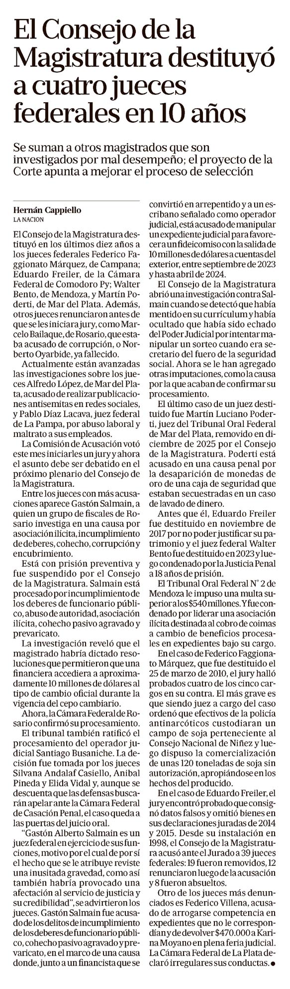 La columna "El Consejo de la Magistratura destituyó a cuatro jueces federales en 10 años" analiza el desempeño y la supervisión judicial, resaltando la necesidad de mejorar los procesos de selección y control de magistrados para fortalecer la justicia. Se enfatiza la importancia de la transparencia y la responsabilidad en el sistema judicial.