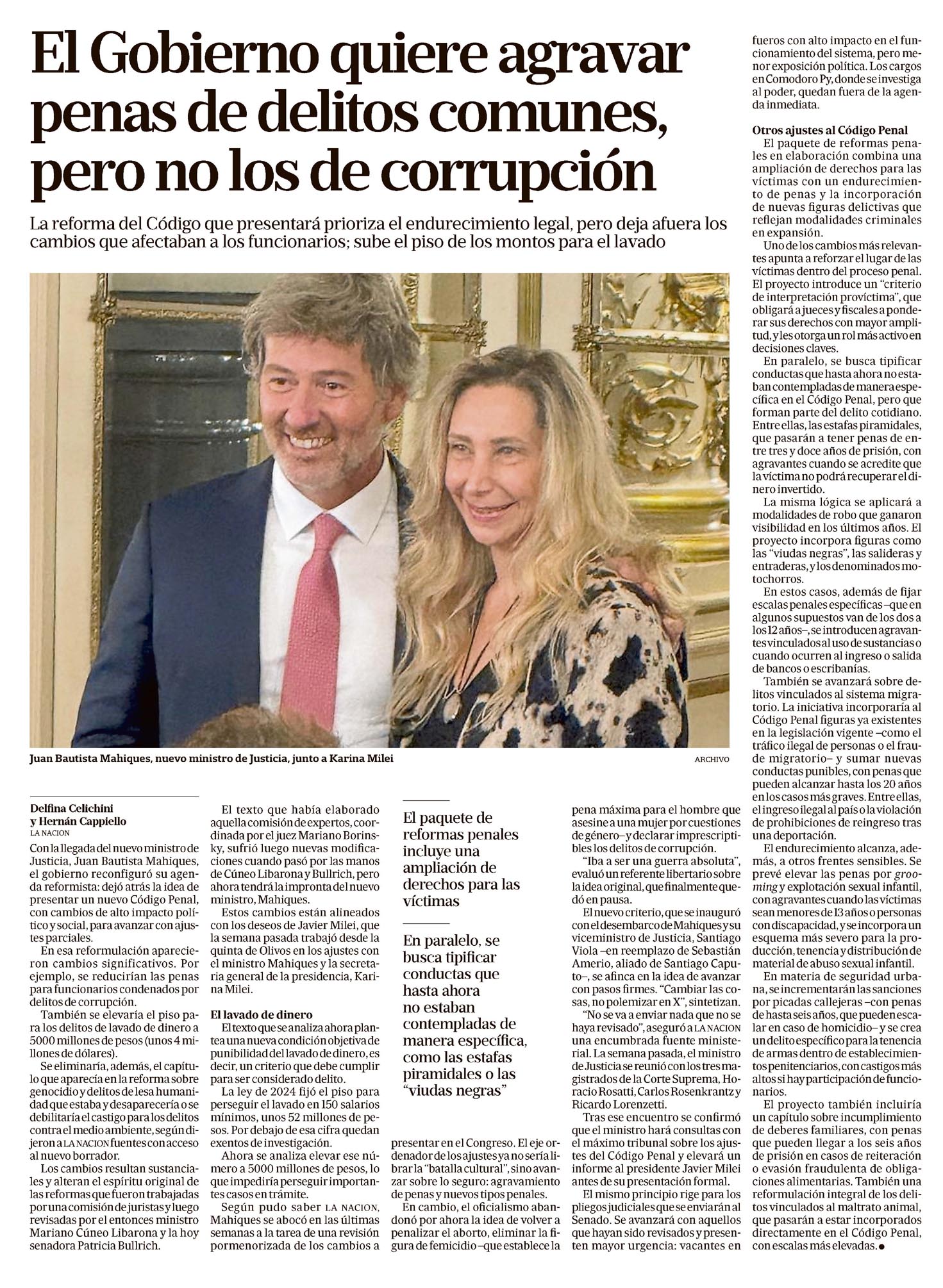 El Gobierno nacional presentará una reforma del Código Penal que busca agravar las penas para delitos comunes, pero excluye modificaciones para delitos de corrupción y eleva los montos mínimos para lavado de activos, según consigna la nota de La Nación . Esta iniciativa apunta a endurecer el marco legal en materia penal sin afectar a funcionarios públicos.