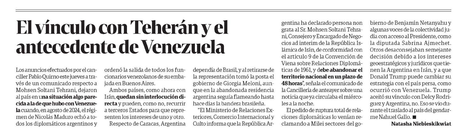 La columna analiza los anuncios del canciller Pablo Quirno sobre Mohsen Soltani Tehrani y los compara con situaciones previas relacionadas con Venezuela. Se enfatiza la sensibilidad diplomática y las implicancias políticas de estos vínculos para Argentina en el contexto internacional.