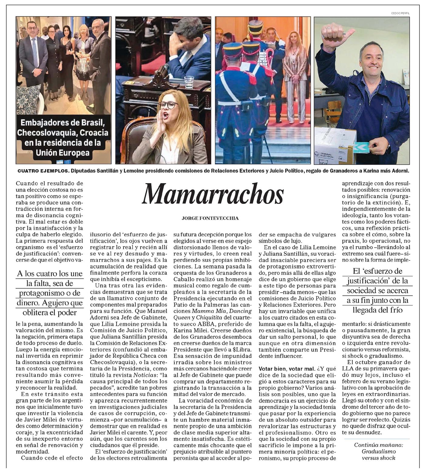 En esta columna, el autor critica la designación de diputadas Santillán y Lemoine en comisiones clave como Relaciones Exteriores y Juicio Político, además de otros hechos como el regalo de Granaderos a Karina y el caso Adorni. Se subraya la falta de coherencia y errores políticos que afectan la imagen del oficialismo.