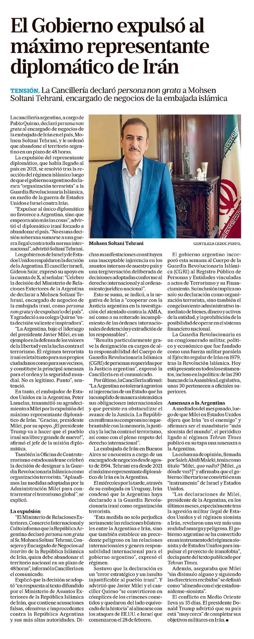 El Ejecutivo nacional tomó una medida diplomática de alto impacto al expulsar al máximo representante de Irán en el país, en un contexto de tensión internacional que incluye el derribo de dos cazas estadounidenses por fuerzas iraníes, según La Nación y Perfil. Esta decisión implica un alineamiento claro en la política exterior y repercute en la agenda de seguridad nacional.