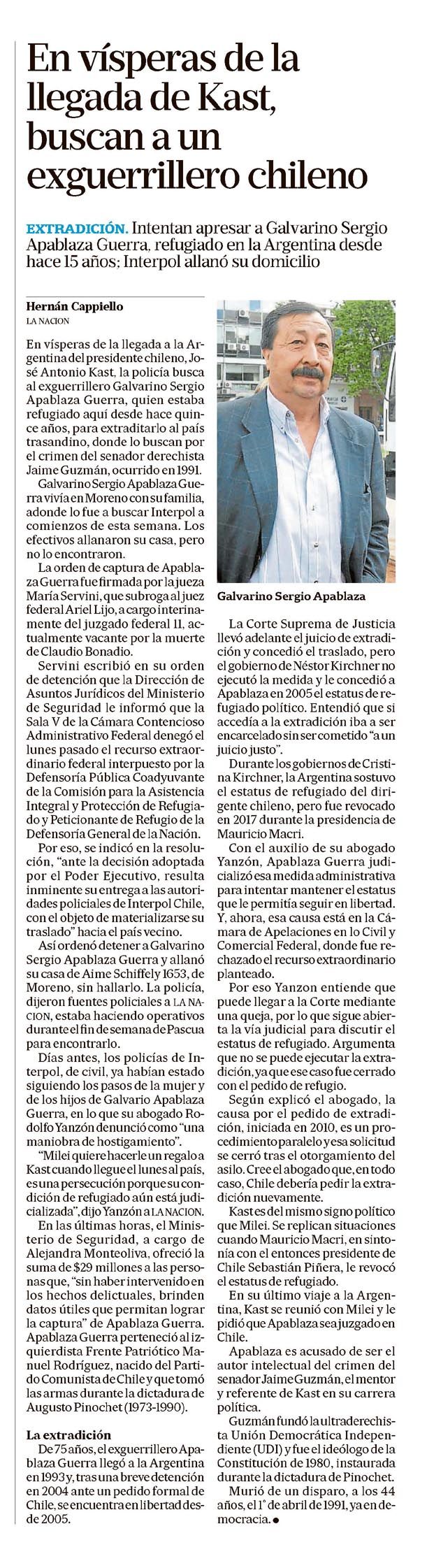 La columna aborda la búsqueda y posible extradición de Galvarino Sergio Apablaza Guerra, un exguerrillero chileno refugiado en Argentina desde hace 15 años. Se destaca el contexto político de la llegada de Kast y la intervención de Interpol, mostrando la tensión diplomática y judicial entre ambos países.