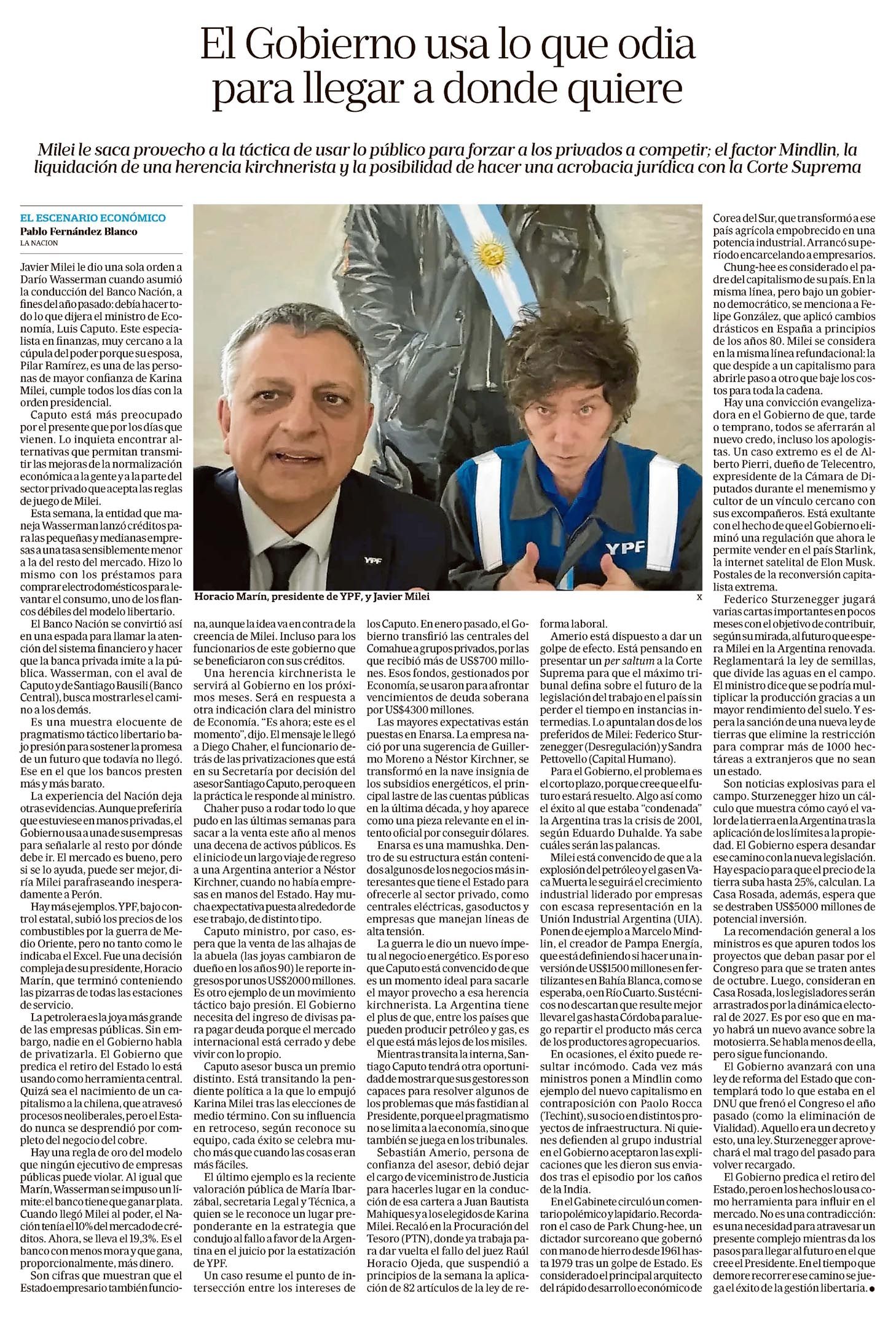 Milei le saca provecho a la táctica de usar lo público para forzar a los privados a competir; el factor Mindlin, la liquidación de una herencia kirchnerista y la posibilidad de hacer una acrobacia jurídica con la Corte Suprema EL ESCENARIO ECONÓMICO Pablo Fernández Blanco LA NACIÓN Javier Milei le dio una sola orden a Darío Wasserman cuando asumió la conducción del Banco Nación, a fines del año pasado: debía hacer todo lo que dijera el ministro de Economía, Luis Caputo.?Leer más