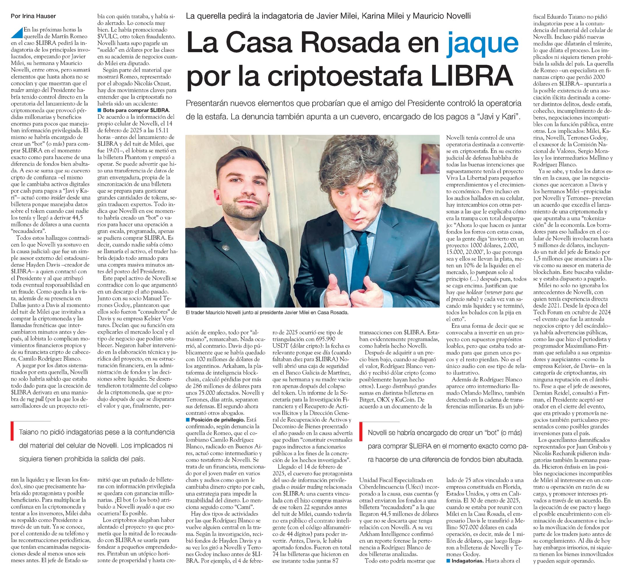 En el ámbito judicial, la investigación por la causa LIBRA avanza con la querella de Martín Romeo que en las próximas horas solicitará la indagatoria de los principales involucrados, empezando por Javier Milei, su hermana y Mauricio Novelli, entre otros, según reporta Página 12.