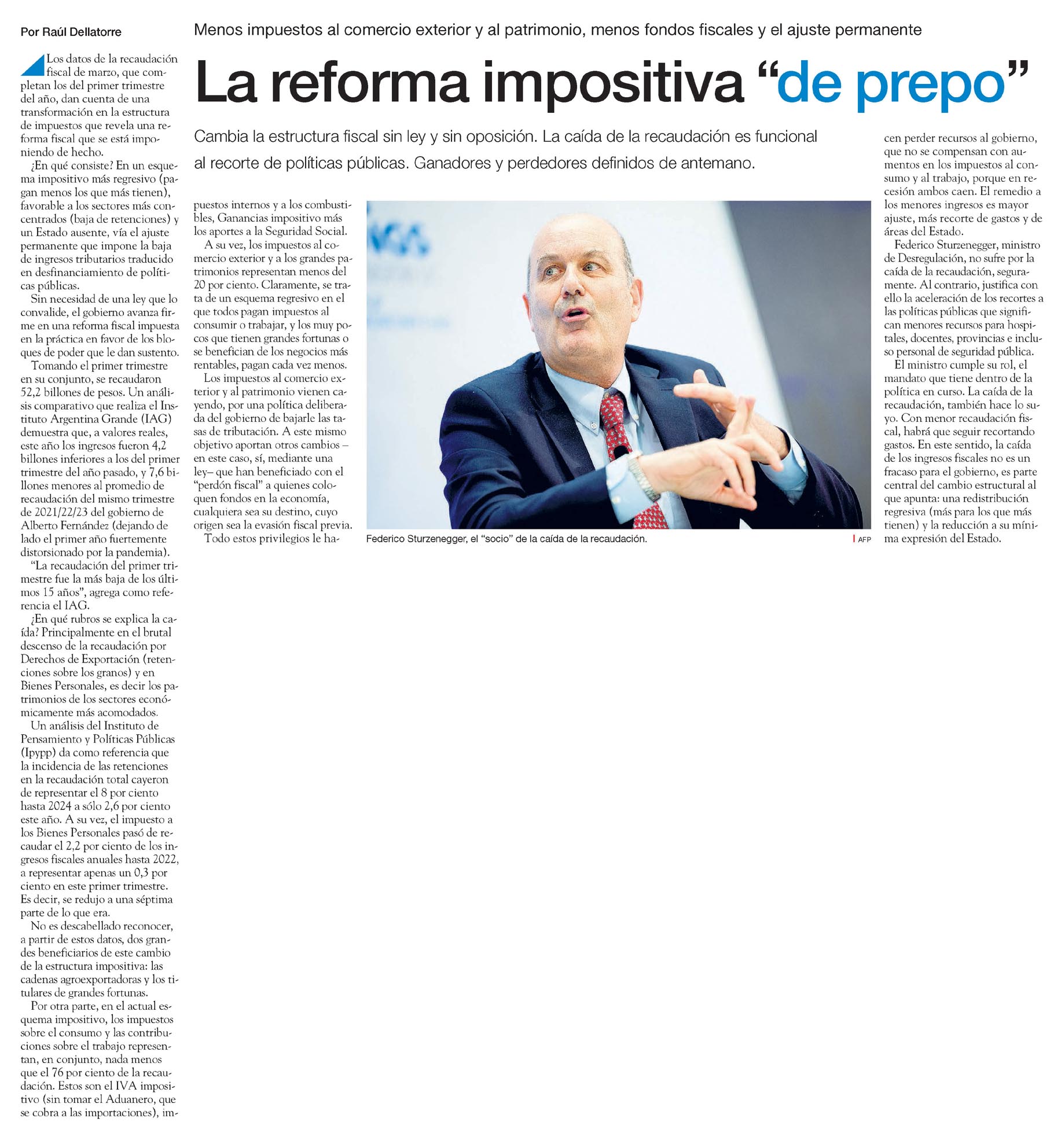 El autor critica la reforma impositiva impulsada sin debate ni ley, que reduce impuestos al comercio exterior y patrimonio, y disminuye fondos fiscales. Destaca que esta caída de la recaudación es funcional a un ajuste permanente que afecta la estructura fiscal del país.
