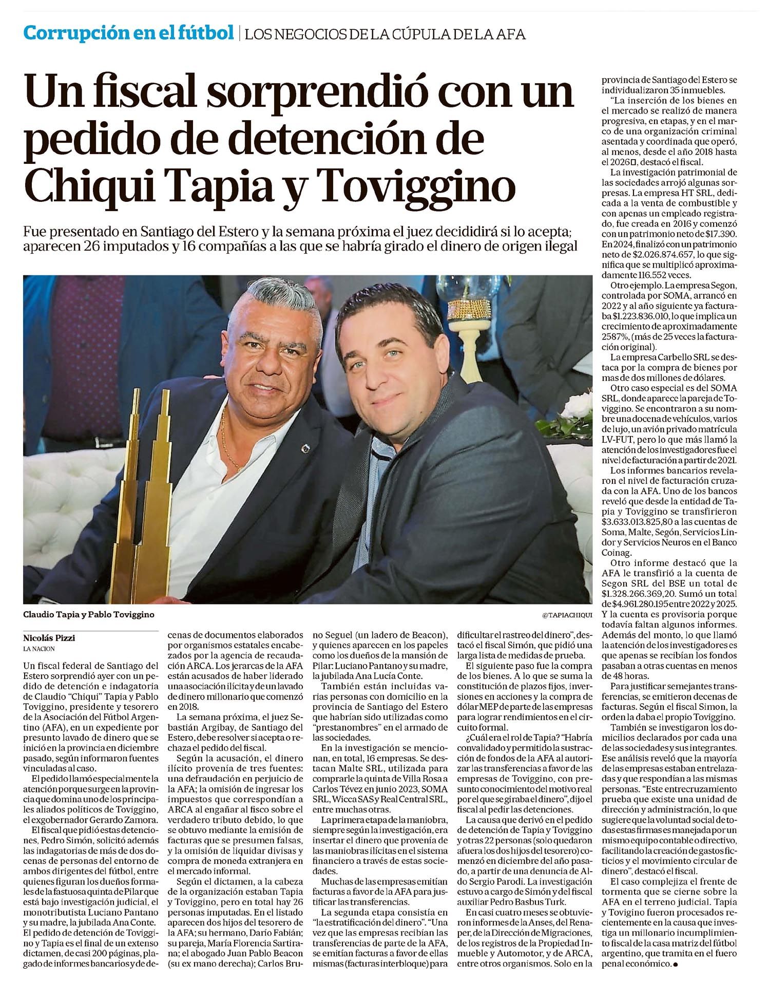 Un fiscal federal de Santiago del Estero presentó un pedido de detención e indagatoria contra Claudio ?Chiqui? Tapia y Pablo Toviggino, presidente y tesorero de la Asociación del Fútbol Argentino, por sospechas de lavado de dinero, según consigna la nota de La Nación. Esta acción judicial podría tener repercusiones en la gestión deportiva y política nacional.