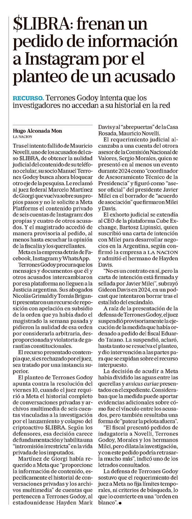 Alconada Mon informa sobre el caso LIBRA, donde un acusado intentó impedir que se accediera a su historial en Instagram. La columna se enfoca en las estrategias legales para frenar investigaciones y la importancia de la información digital en procesos judiciales actuales.