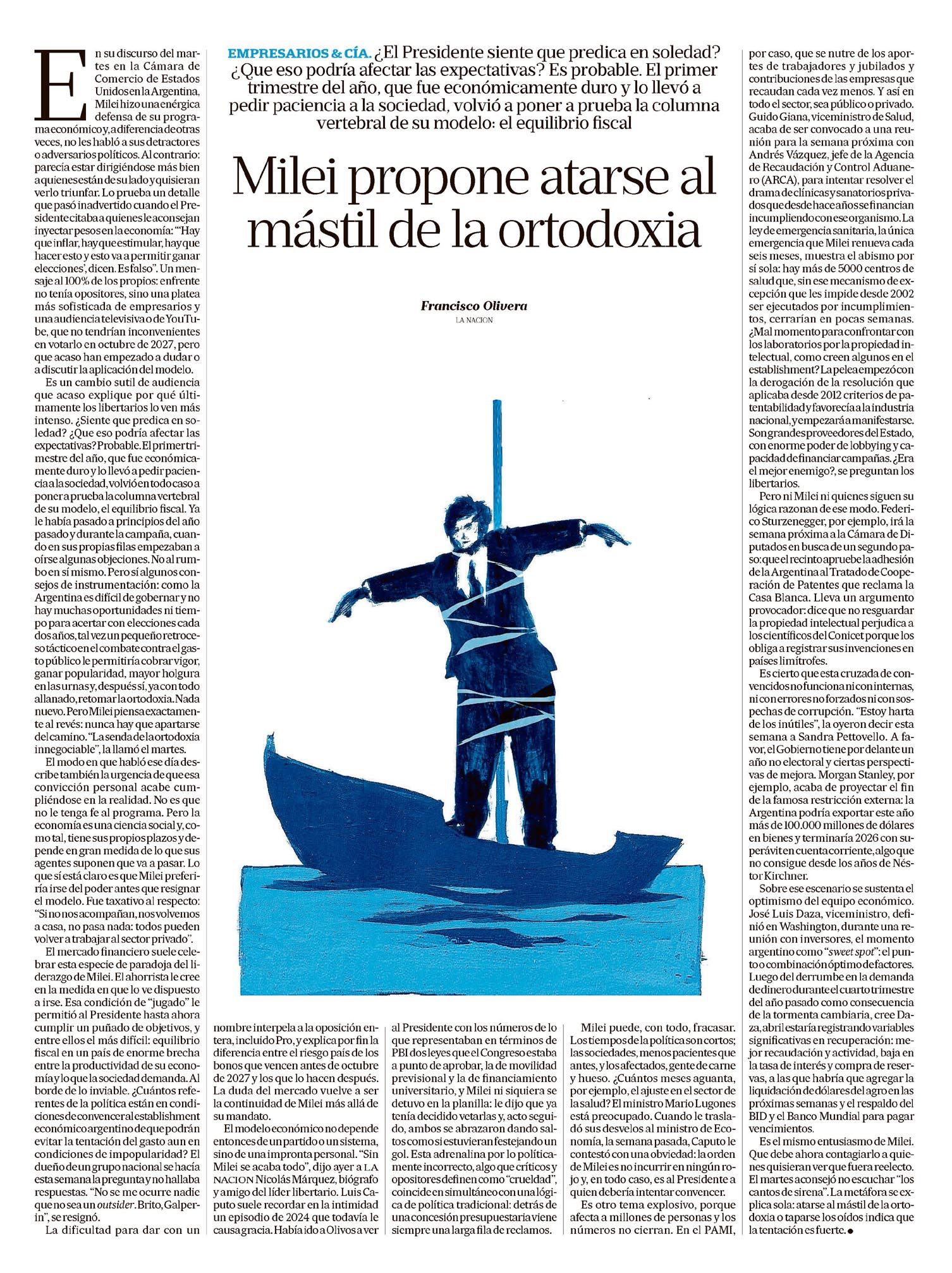Olivera analiza el discurso reciente de Milei en la Cámara de Comercio de Estados Unidos, donde el candidato defendió enérgicamente su programa económico. El autor destaca que Milei busca atarse a la ortodoxia económica para ganar legitimidad, diferenciándose de sus detractores y tratando de consolidar su imagen frente a inversores y sectores formales.
