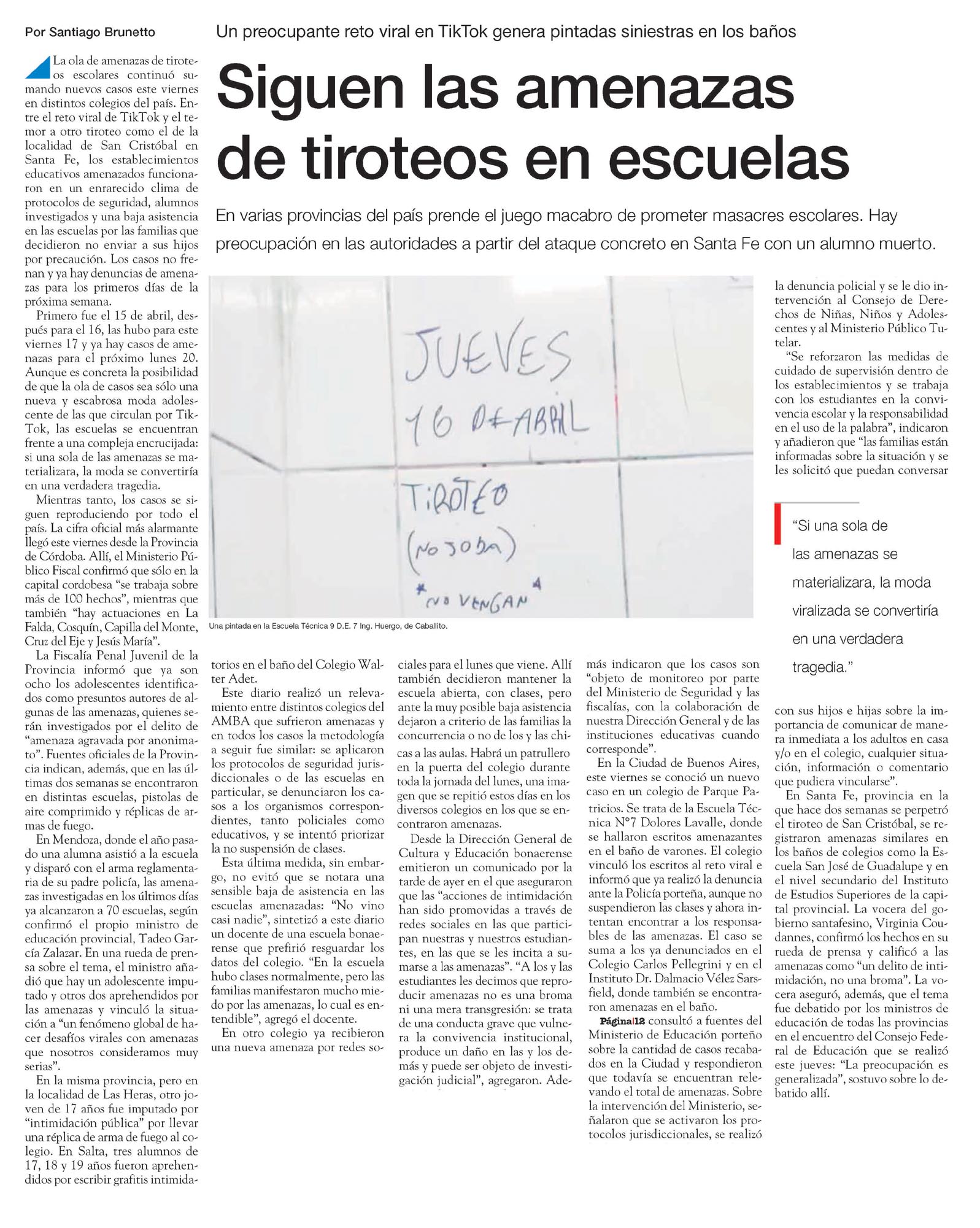 Por Santiago Brunetto La ola de amenazas de tiroteos escolares continuó sumando nuevos casos este viernes en distintos colegios del país.?Leer más