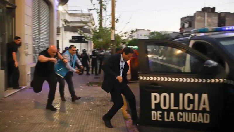 Cerca de las 19, los hinchas se cruzaron con la policía y, en medio del caos, Moretti salió corriendo y escoltado por los efectivos, resguardado en un móvil policial. Una imagen que será difícil de olvidar.
