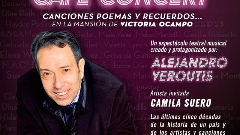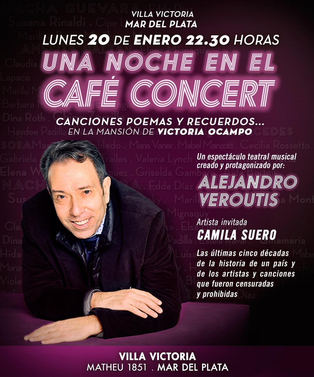 "Una Noche en el Cafè Concert". Donde Alejandro Veroutis te propone vivir un encuentro mágico en el marco de una velada donde las canciones y los recuerdos de aquellas noches de un género teatral y musical que se llamó café concert vuelven a cobrar vida y sentido en una noche de ?hoy como ayer?. Junto a artistas invitados, te transportan a la historia de un género teatral y argentino llamado café concert, aquel hito de nuestro teatro que vio nacer a figuras de la talla de Antonio Gasalla, Nacha Guevara, Cipe Lincovsky, Enrique Pinti, Susana Rinaldi y muchos más que hicieron época.