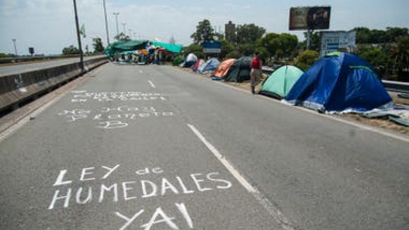 En una de las manos del puente hay unas 50 carpas que instalaron el sábado integrantes de la Multisectorial por los Humedales, un colectivo que agrupa a decenas de organizaciones ecologistas, sociales y políticas, que anunciaron la protesta continuará hasta el lunes 30 de noviembre, cuando termina el período ordinario de sesiones de la Cámara baja y aún resta que el proyecto pase por el resto de las comisiones.