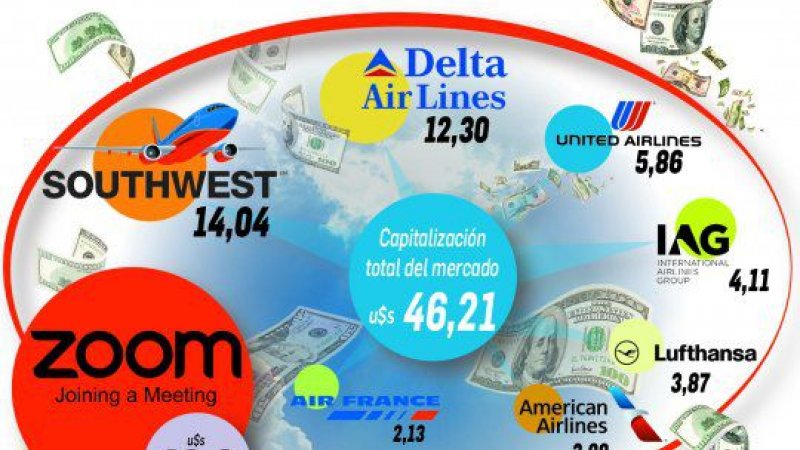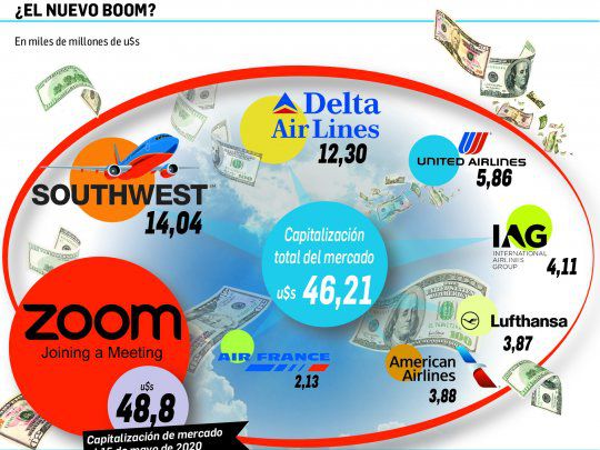 Y siguiendo el ejemplo de videoconferencia vs. viaje de negocios, Lennart Dobravsky, director de Research e Intelligence de LIH, comparó la valuación de las primeras 5 aerolíneas por facturación del mundo (AirFranceKLM, United, Lufthansa, American y Delta) al 4 de mayo pasado y valían u$s35.200 millones cuando Zoom ya valía u$s37.700 millones. Luego Iman Ghosh de VisualCapitalist fue más allá y comparó la capitalización de Zoom al 15 de mayo (u$s48.800 millones) contra el de las primeras 7 aerolíneas del mundo (Southwest, Delta, United, IAG, Lufthansa, American y AirFranceKLM) que no llegan juntas a u$s46.200 millones. Vale señalar que estas aerolíneas el 31 de enero pasado valían u$s121.300 millones.