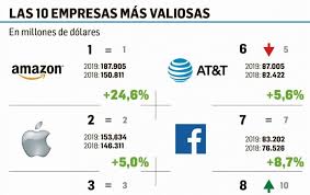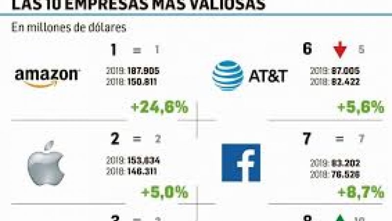 La gigante del comercio electrónico Amazon encabeza el listado (al igual que en 2018) con un valor de mercado de u$s187.905 millones. Las otras dos que suben al podio también repiten la performance del año pasado: Apple (u$s153.634 millones) y Google (u$s142.755 millones).
